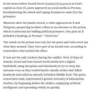 نیویورک‌تایمز نوشته همزمان با حمله اسرائیل به زندان اوین، توییت‌هایی به فارسی مردم رو تحریک به رفتن درب زندان کرده که حالا محققان تشخیص دادن این توییت‌ها کار ارتش اسرائیل و بخشی از تلاش‌های این ارتش در جنگ بوده. همچنین تخریب شخصیت سردار قآنی هم توسط ارتش اسرائیل انجام شده.